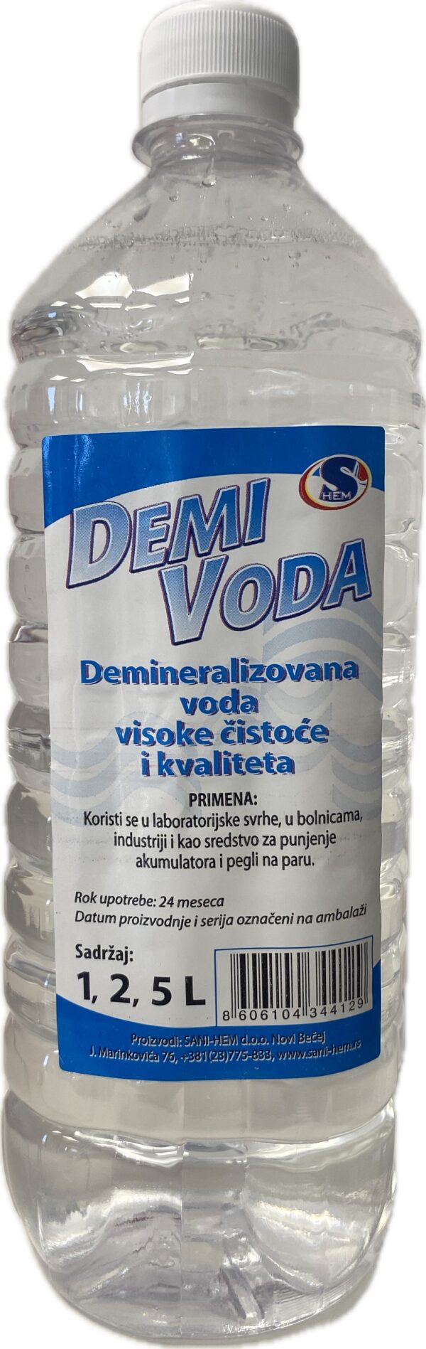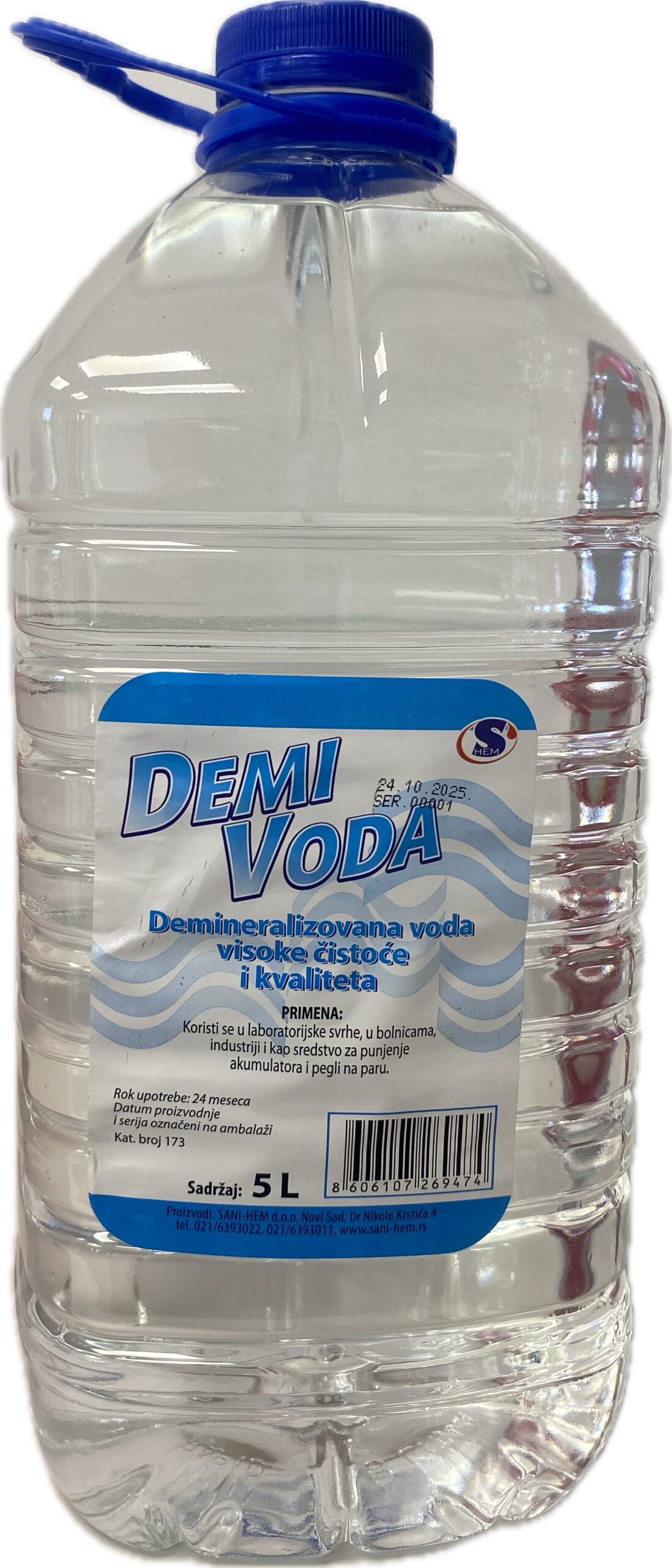 DEMI VODA dobijena procesom reversne osmoze, iz koje su uklonjeni gasovi, joni, bakterije, čvrsti kontaminanti i druge materije organskog i neorganskog porekla. Namenjena je za laboratorije, industrijsku upotrebu i domaćinstva. Može se koristi i za punjenje akumulatora, za rashladne sisteme, za pripremu antifriza, za pegle na paru i druge slučajeve primene u skladu sa preporukom proizvođača opreme