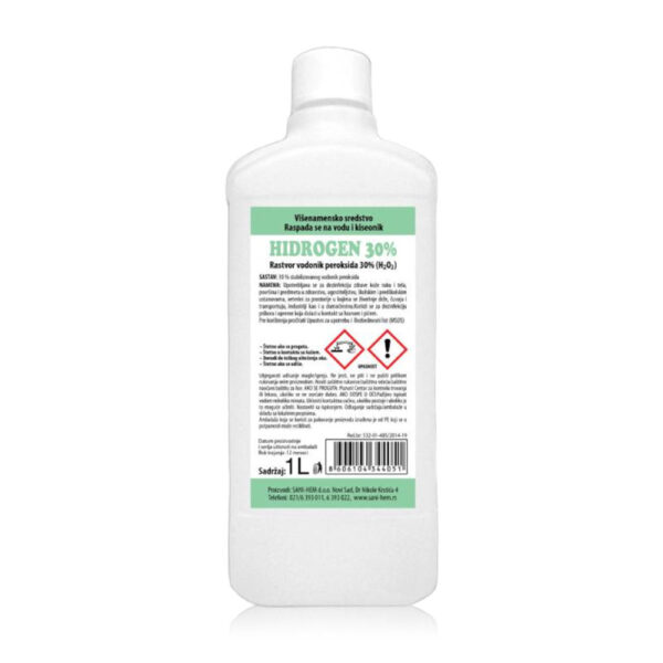 HIDROGEN 30 ( H2O2 ) je bezbojno sredstvo koje u sebi sadrži 30 % stabilizovanog rastvora vodonik peroksida koji se posle upotrebe rastvara na vodu i kiseonik tako da se tretirane površine i predmeti posle dezinfekcije ne ispiraju vodom.
