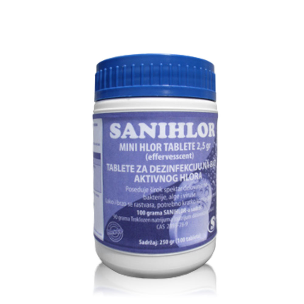SANIHLOR – tablete bele boje izuzetno širokog antimikrobnog spektra delovanja, sa blagim mirisom hlora. Lako topive u vodi. Njihova aktivnost se zasniva na disocijaciji u vodenom rastvoru na HOCl ( hipohlorna kiselina ) koja ima 80-100 puta jače germicidno dejstvo od hipohloridnog jona. Još nije naučno dokazano kompletno dejstvo hlora ali se pretpostavlja da on prolazi kroz opnu ( ćelijsku membranu) i razara enzimski sistem ćelije.